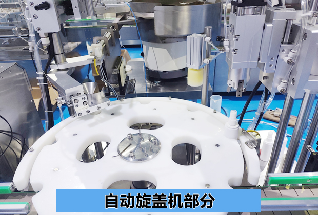 這一部分主要是負責對容器旋蓋,采用旋轉和直線振動盤理蓋方式,兼容噴霧蓋、螺紋蓋等多種形狀的蓋子,自動整理上蓋。上蓋采用氣缸下壓方式,壓蓋頭內置真空吸盤,落蓋穩準,不掉蓋,自帶抱瓶裝置,保證機械抓手高速旋蓋時,瓶子不會倒。