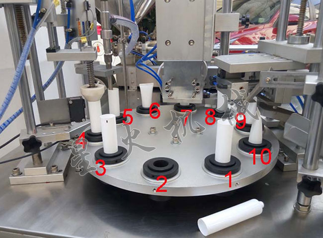 全自動(dòng)十工位轉(zhuǎn)盤控制,自動(dòng)落管、灌裝、焊接、切余料、頂出,計(jì)算產(chǎn)量,印有日期并焊接速度快。