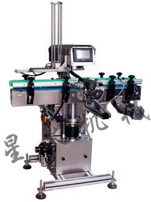 當真空傳感器檢測得的數值達到設定數值時,托盤把瓶子向上托起,同時旋蓋機頭開始旋轉。當瓶口與瓶蓋接觸時,托盤底板開始受到到向下壓力,托盤上的托爪機構會把瓶身夾緊,同時蓋子頂面和硅膠旋蓋盤面之間也受到相等的壓力,旋蓋盤通過摩擦向蓋子傳遞扭蓋力矩,使蓋子的鉤爪沿瓶口螺紋旋入,旋蓋阻力增大時,旋蓋盤會停止轉動。本機型采用定扭力控制旋蓋的,扭力通過位于機身側面的氣壓旋鈕調節。