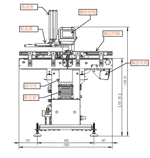 完成灌裝工序沒有加蓋子的瓶子從機器的進出罐輸送左側進入,在輸送器的兩側擋板上裝有氣動的擋罐裝置,擋罐器的作用是確保每次只有一個瓶子進入推送位置,并且在在抽真空旋蓋過程中其它瓶子不會誤入。