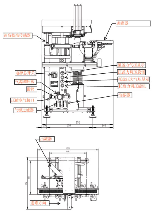 XH30K型旋開蓋真空旋蓋機(玻璃瓶)所需要配置的輔機有:一臺真空泵(推薦型號XD-040),一臺空氣壓縮機(排量0.1立方以上),一個真空儲壓罐(一般為40升以上的金屬容器,建議用空的家用液化氣罐)。